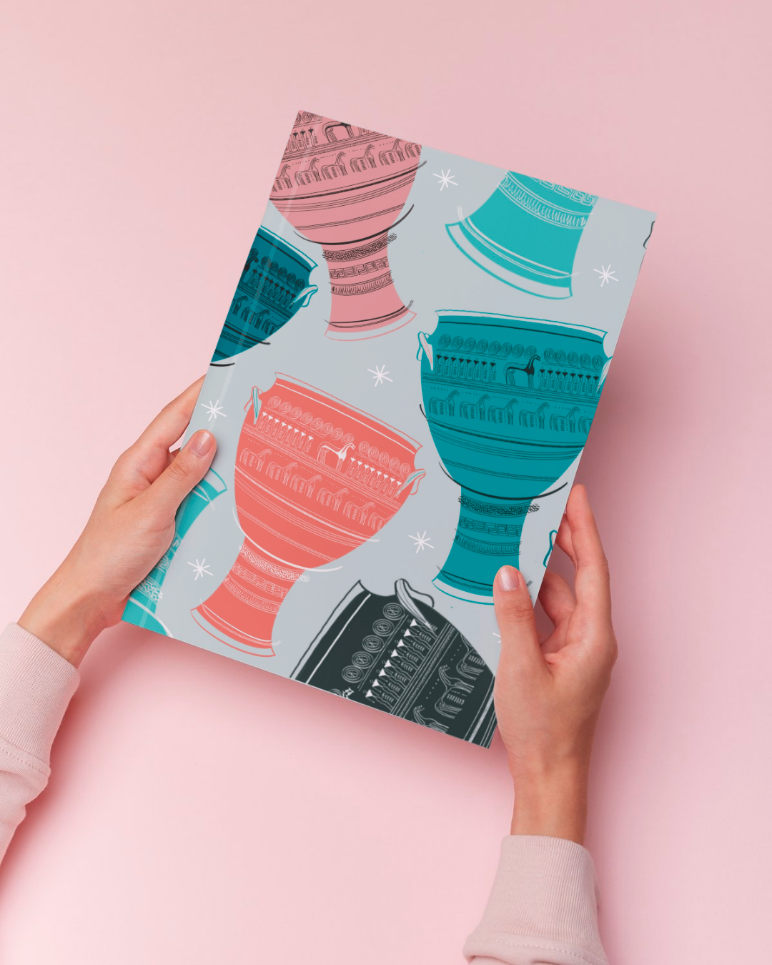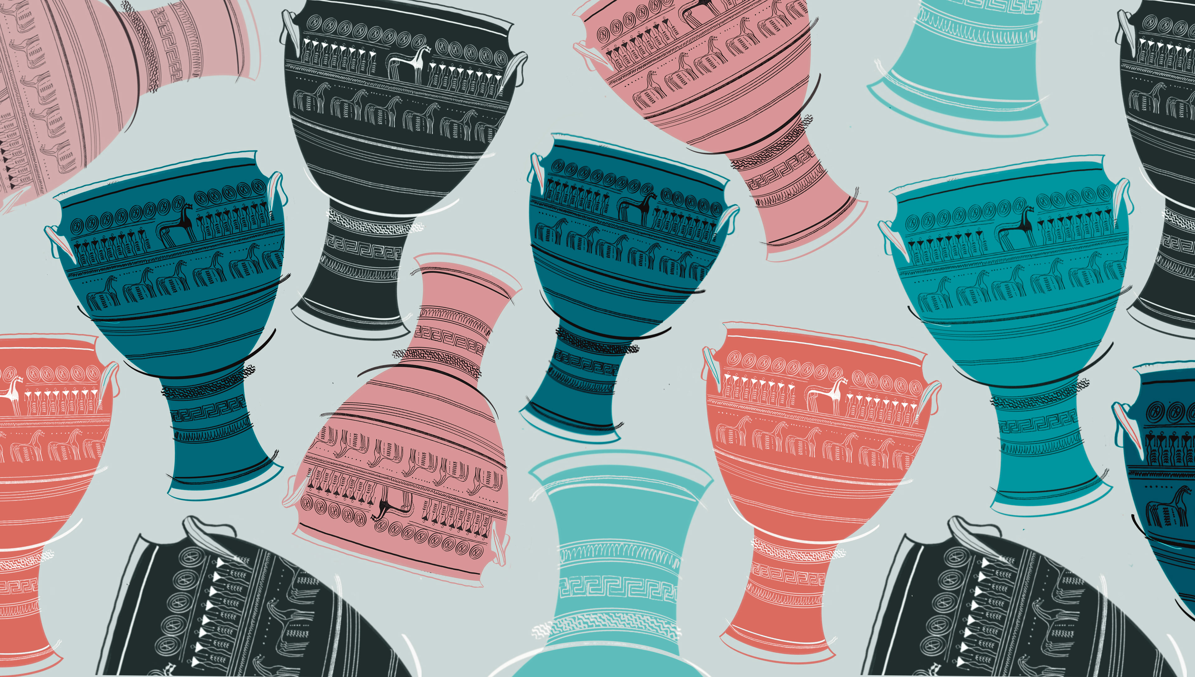 Based on an Attic geometric krater (c. 770 BC) from the Metropolitan Museum of Art, the design combines geometric forms, animal motifs, and a refined colour palette.