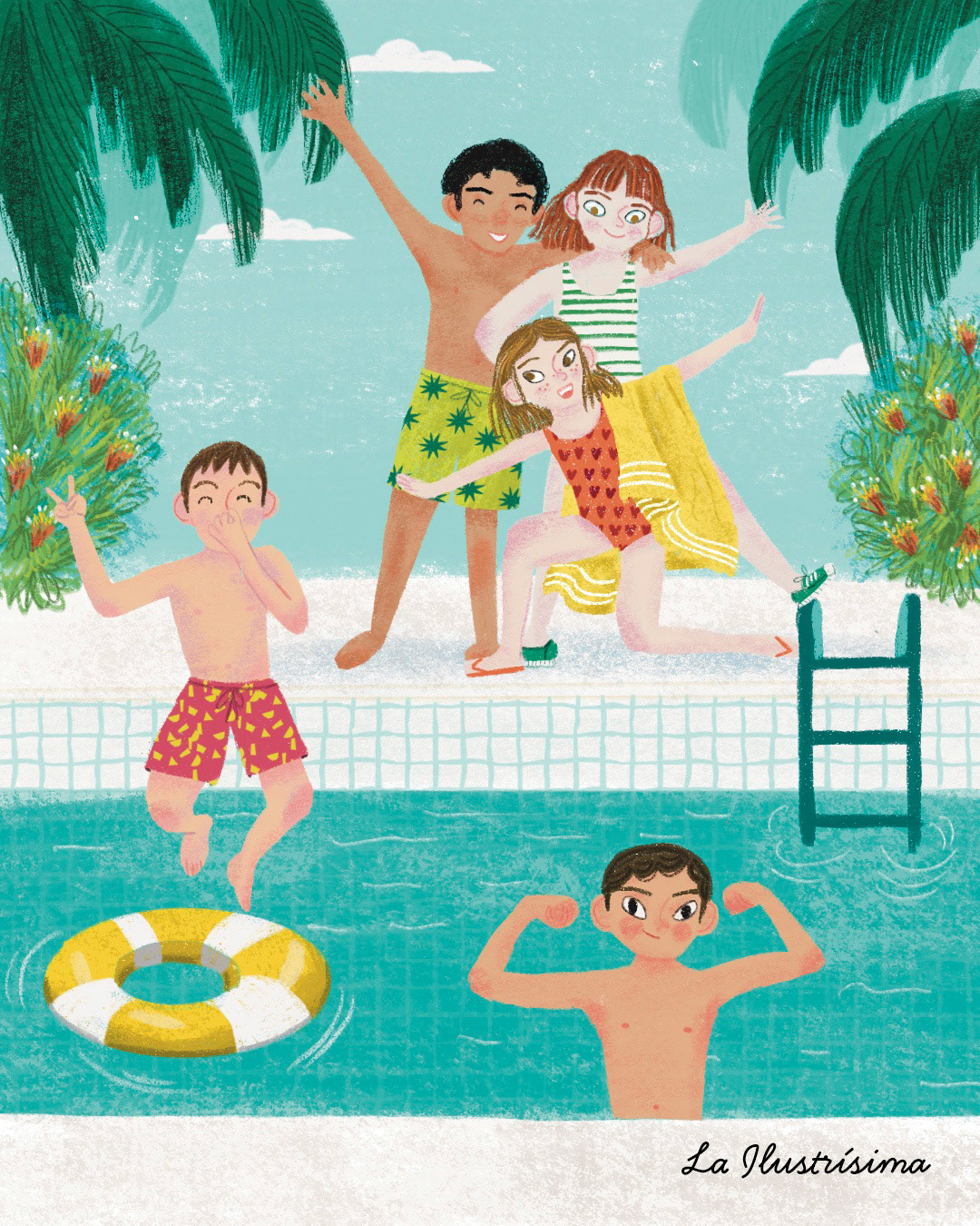 Una ilustración inspirada en los veranos de la infancia, cuando las vacaciones de verano se sentían felices y eternas, rodeadas de amigos y familia.